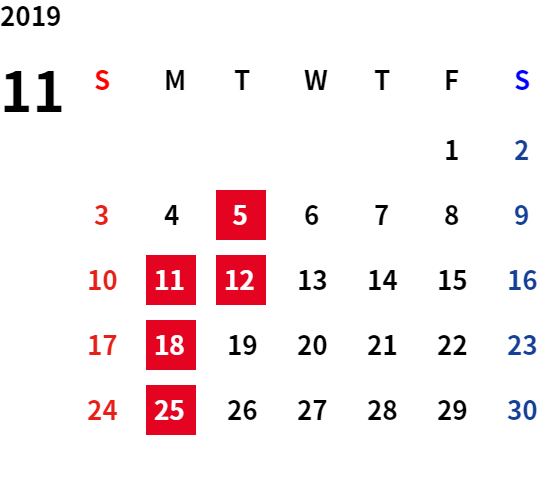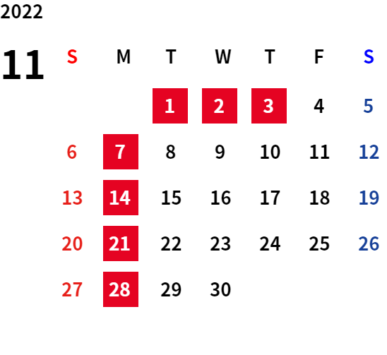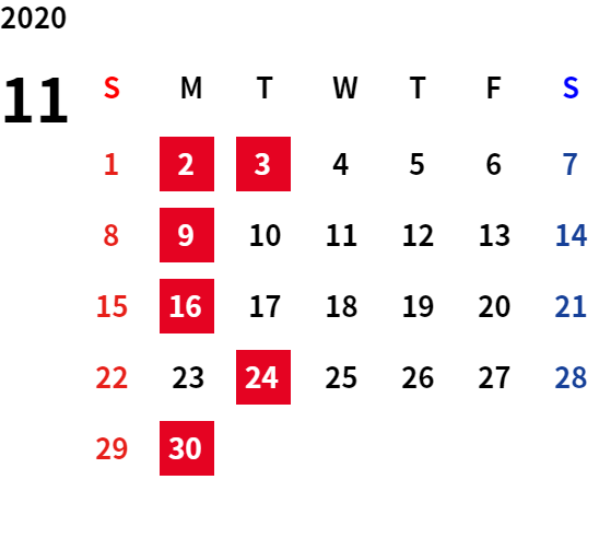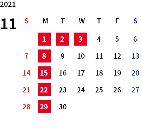 こんにちは!!ブログ担当です!! 気がつけばもう10月も終わり! だんだんと日が短くなってきて、秋冬を感じる季節となってきましたね。 朝晩は冷え込みが厳しくなってきているので、体調管理には気をつけていきましょう~ 今回は、11月の定休日のご案内です。 11月も10月と同様にいつもと違うお休みとなっております。 毎週月曜日に加えて、11月4日(火)もお休みとなりますので、 皆様には、大変ご迷惑をおかけいたしますが、ご理解の程よろしくお願いします。