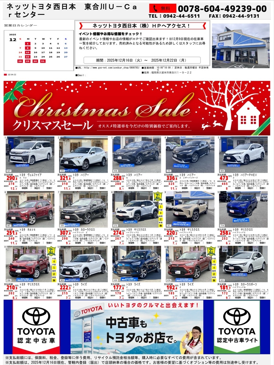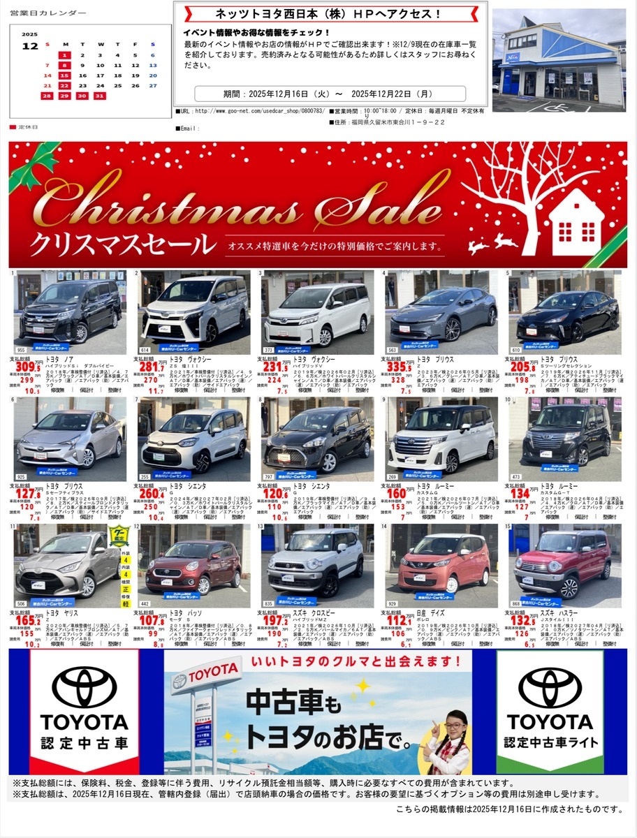 クリスマスフェア開催中❕ 2025.12.16 クリスマスフェア クリスマスフェアを12月25日(木)まで開催しています。 ご来店プレゼントをご用意して皆様のご来店お待ちしております U-Car情報はこちらから 前の記事へ 店舗ブログ一覧に戻る 次の記事へ