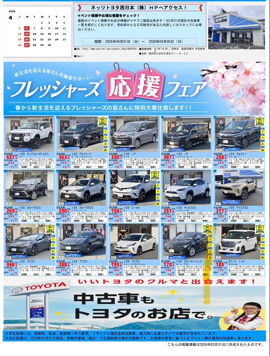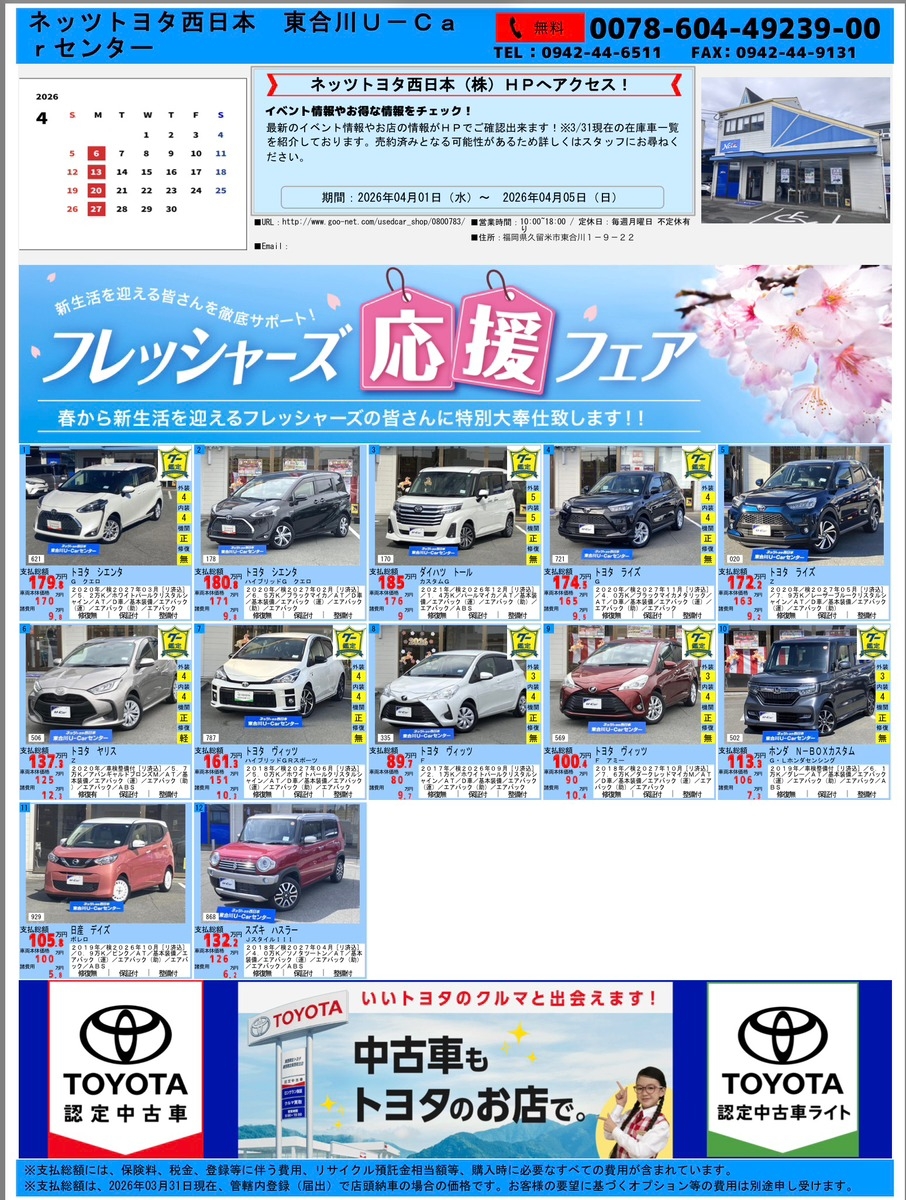 車両紹介 2026.04.02 展示車両 中古車 みなさまこんにちは! 東合川U-Carセンターです🚗 現在の当店の展示車の紹介です。 色々な車を展示しています。ご来店して頂き気になる車を見て触れてください。 前の記事へ 店舗ブログ一覧に戻る 次の記事へ