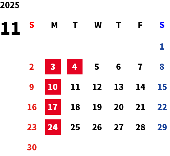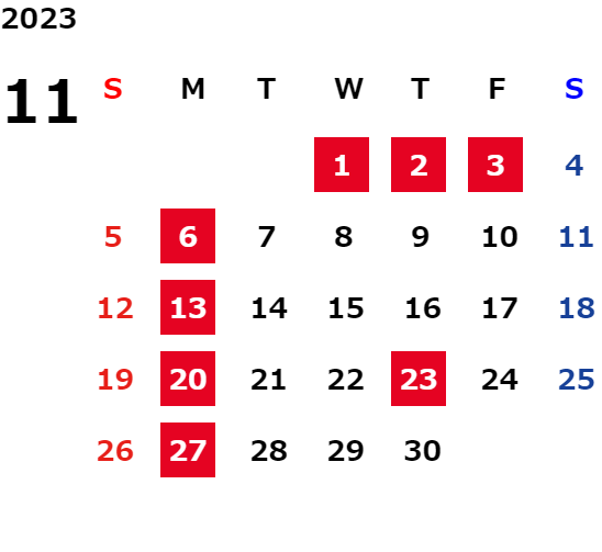 こんにちは😃 百年パーク店です(*^◯^*) 最近は急に肌寒くなってきましたね。 季節の変わり目なので体調には十分お気をつけください(^-^) さて、11月の営業日についてお知らせいたします。 11月は定休日の月曜日に加えて4日の火曜日もお休みを頂いております。 ご迷惑をおかけしますが宜しくお願いいたします。