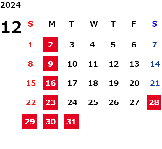 こんにちは♪ 百年パーク店の田崎です(^▽^)/ 一気に凍えるような寒さになってしまいましたね🥶 皆様クリスマスやお正月のご予定はお決まりですか? 私はお家でぬくぬく過ごす予定です♪ クリスマスマーケットは毎年賑わっているので行こうかな〜と迷っております🙌 さて12月は定休日の月曜日に加えて28日(日)から1月5日(月)までの期間お正月休みを頂きます。 ご迷惑をおかけしますが宜しくお願いいたします。